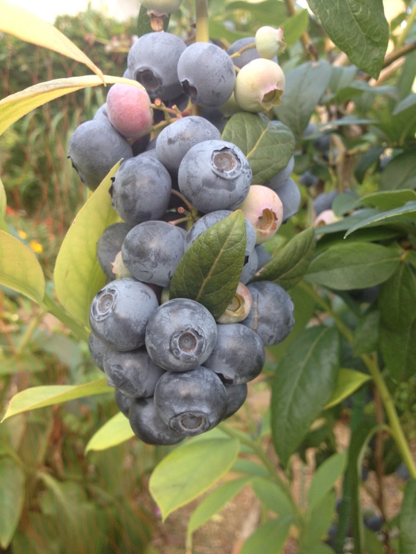 昨日、家庭菜園のブルーベリーを収穫しました。1センチ〜2センチくらいの大きな実がなります。(これはエリザベスという種類のものでしょうか?プルーベリでは大きいので、マギ)